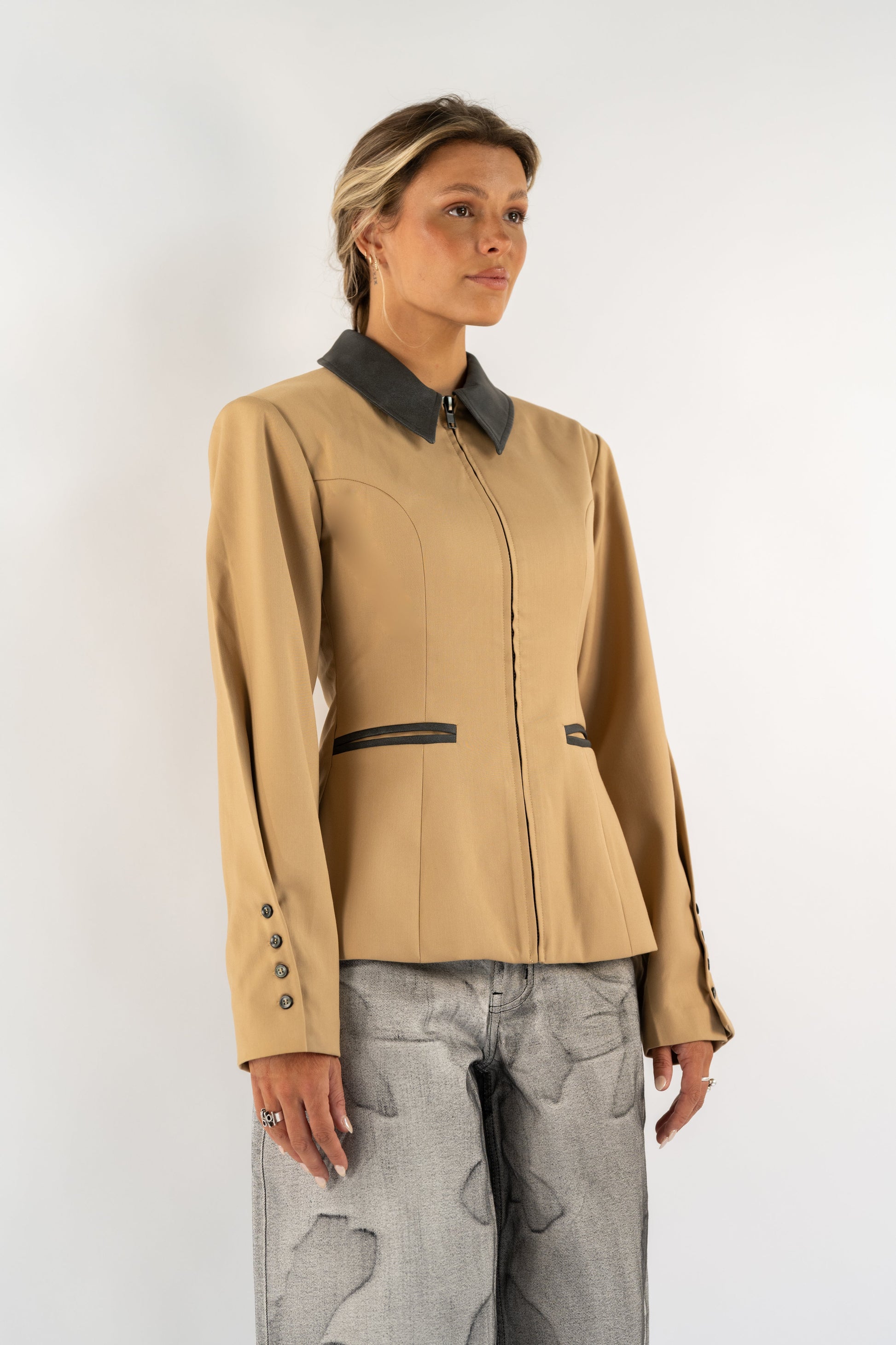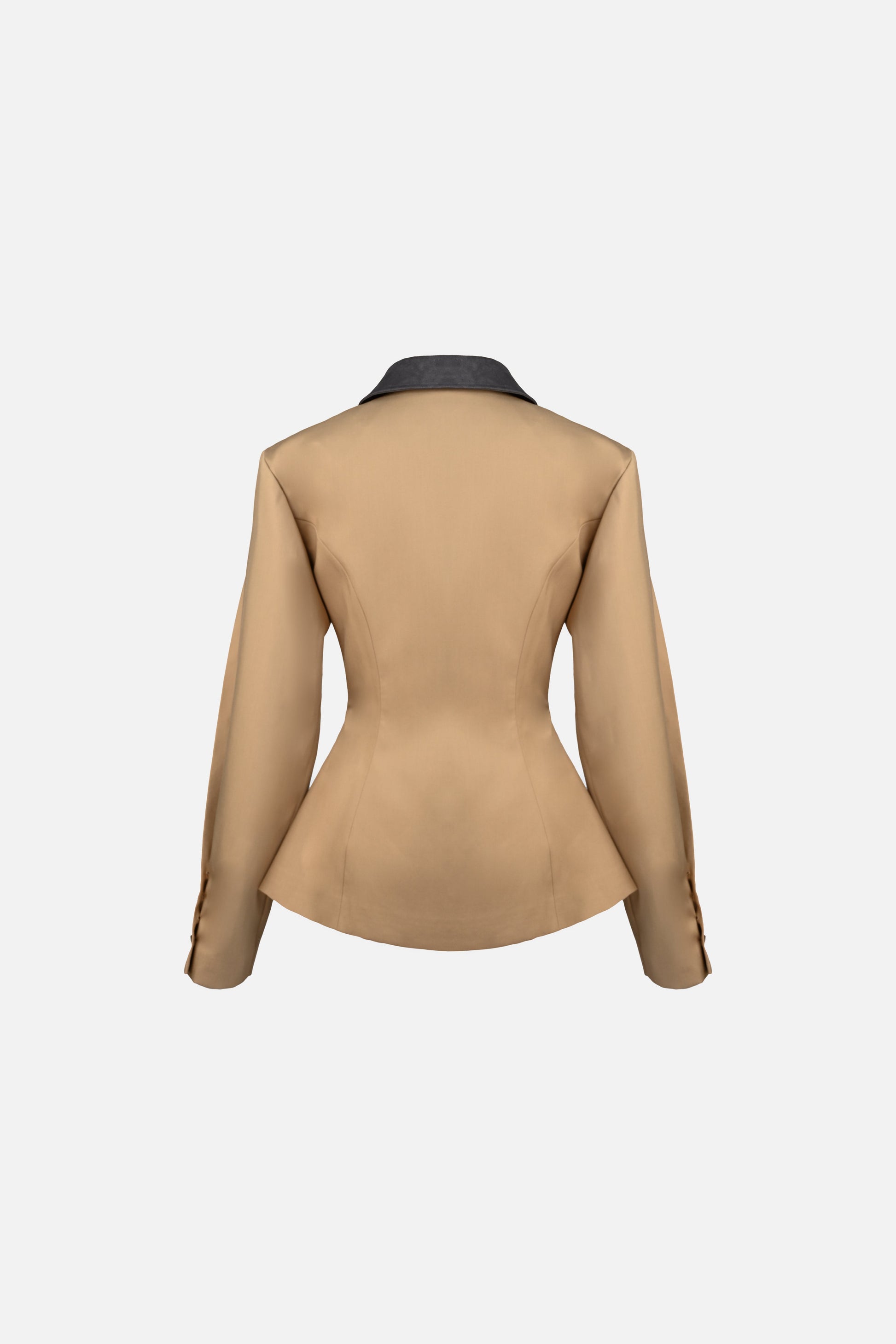 The Clarke Jacket displays precise tailoring with a sculpted waist and pleated sleeves from structural seaming. The earthy camel coloring contrasts the dark leather collar and welt pockets.