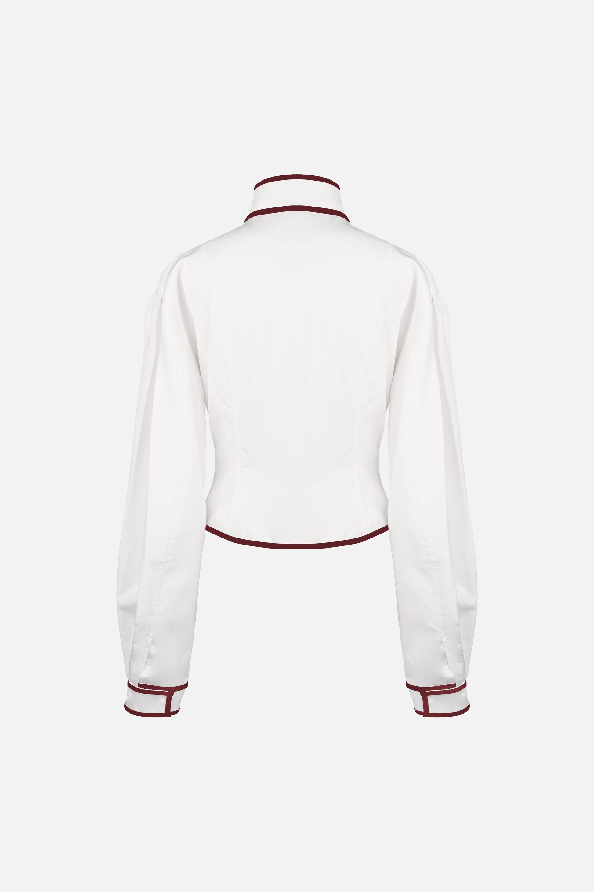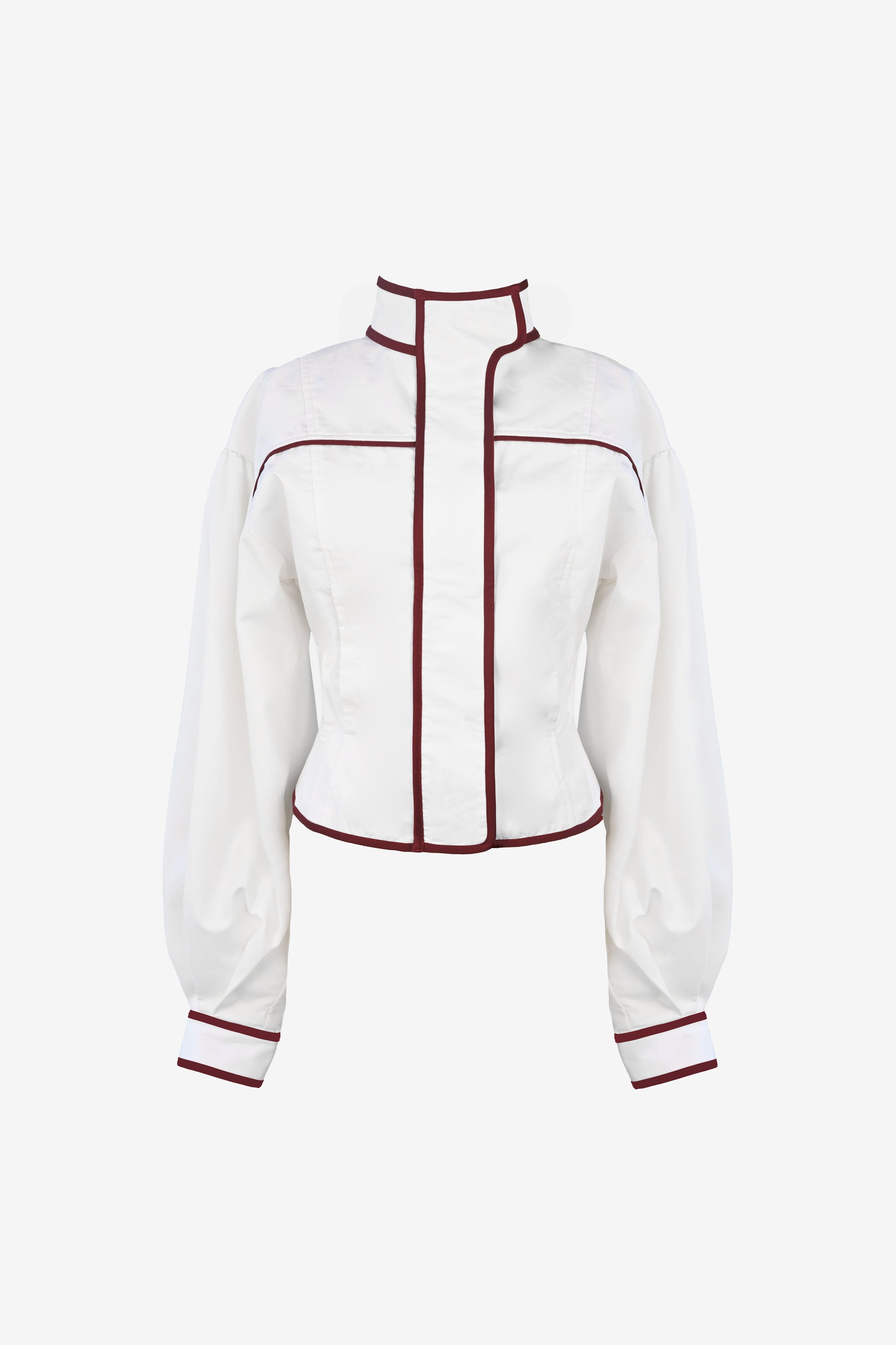A sculptural construction, the Mindy Jacket is defined by its voluminous sleeves and sharply tailored lines. The exaggerated silhouette floats effortlessly, while warm burgundy piping traces its architectural structure.