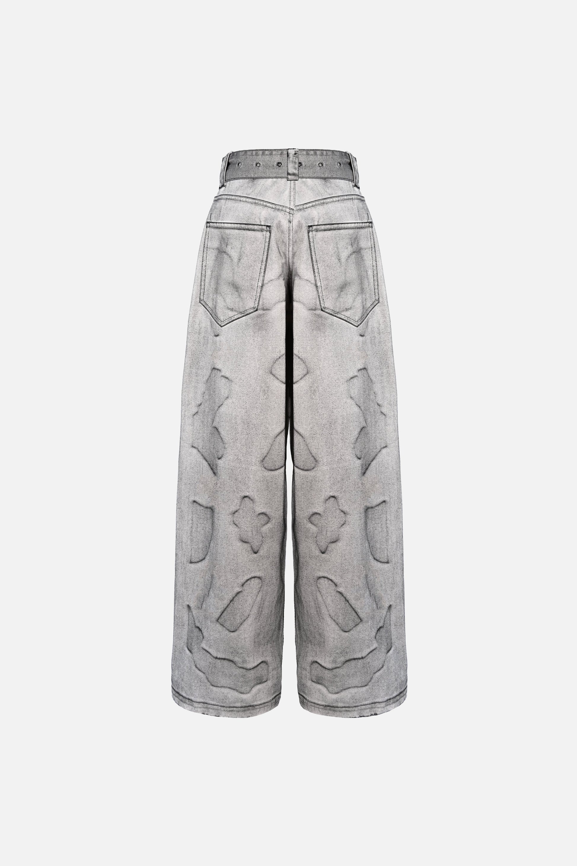 Faria Belted Jeans are crafted from an acid-wash grey denim, etched with tonal washes from waist to hem. Anchored by an oversized silver matte buckle, Faria is a mix of utility and expression.