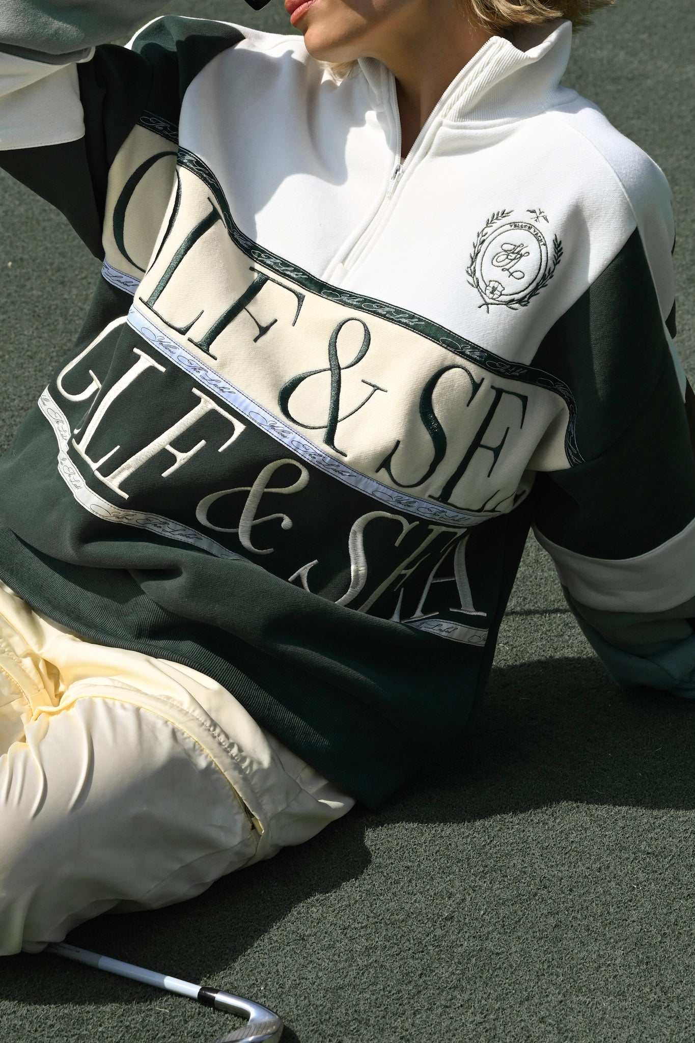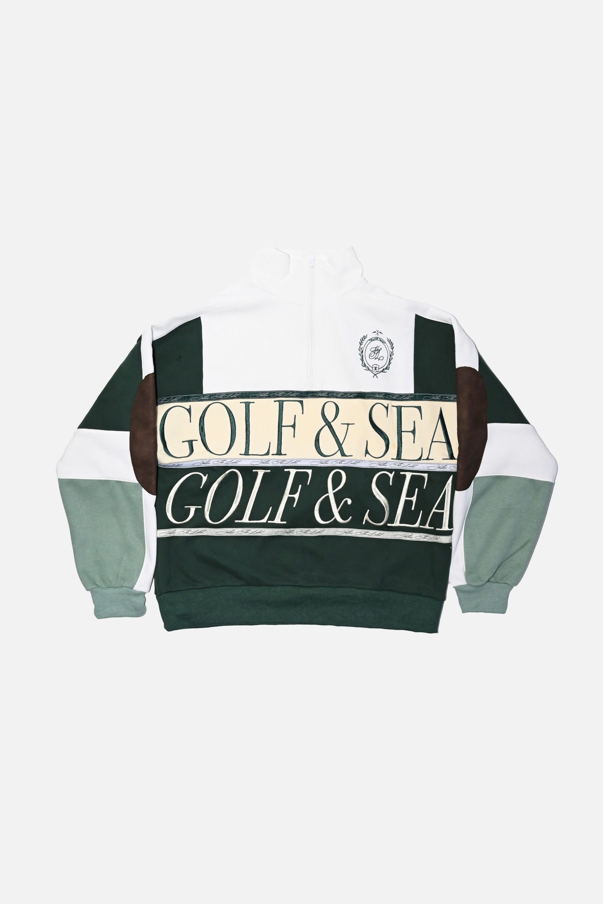 Tee time attire. Our classic fleece style sweatshirt with a ribbed collar quarter zip. Retro stripes of greens, butter yellow, and white frame the sweatshirt and feature embroidered details across chest with dark leather elbow patches.