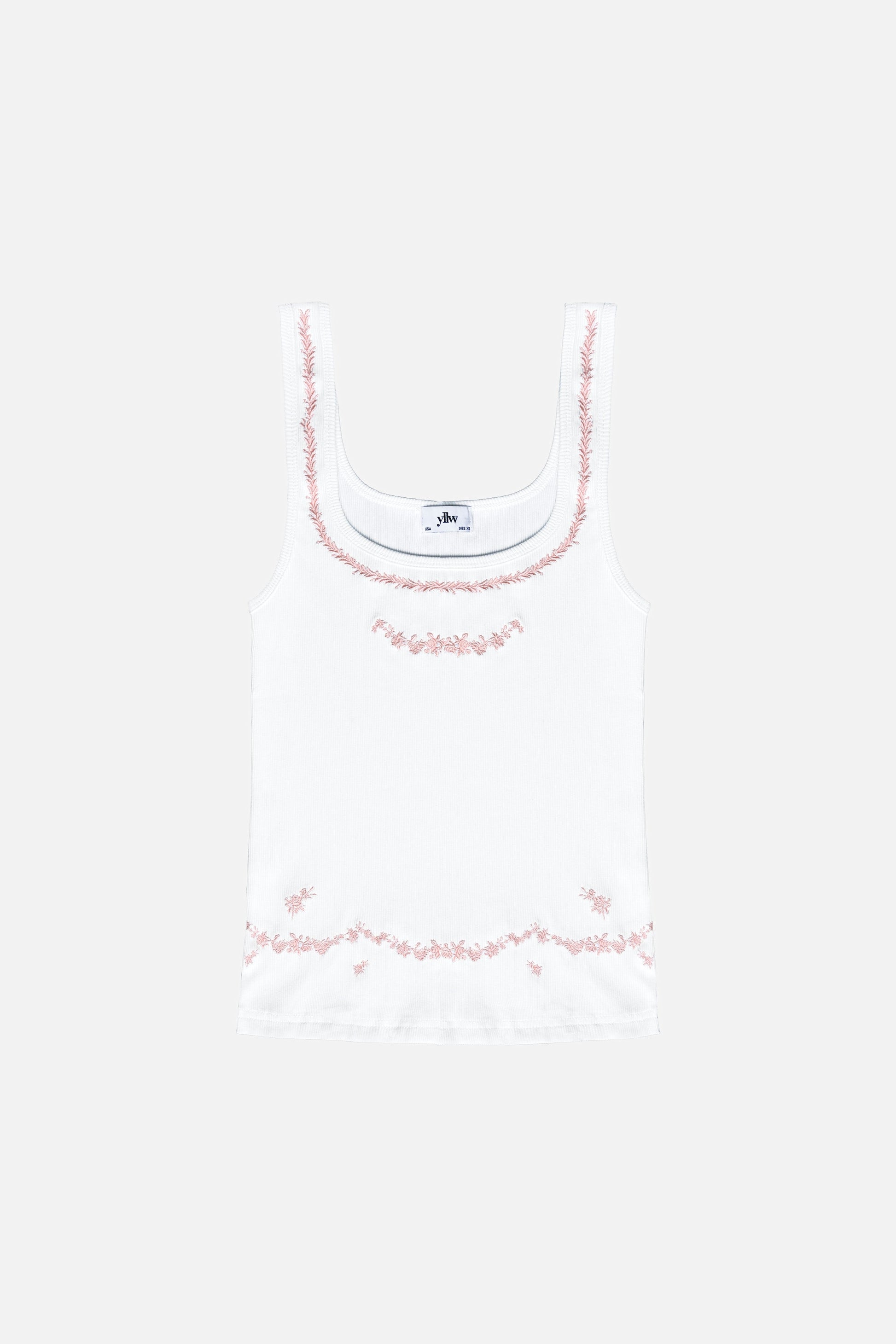 Our Jules Tank features embroidered florals and leaflets across the front and back. Slim fit tank top in a ribbed knit featuring a square round neckline and narrow tank straps.