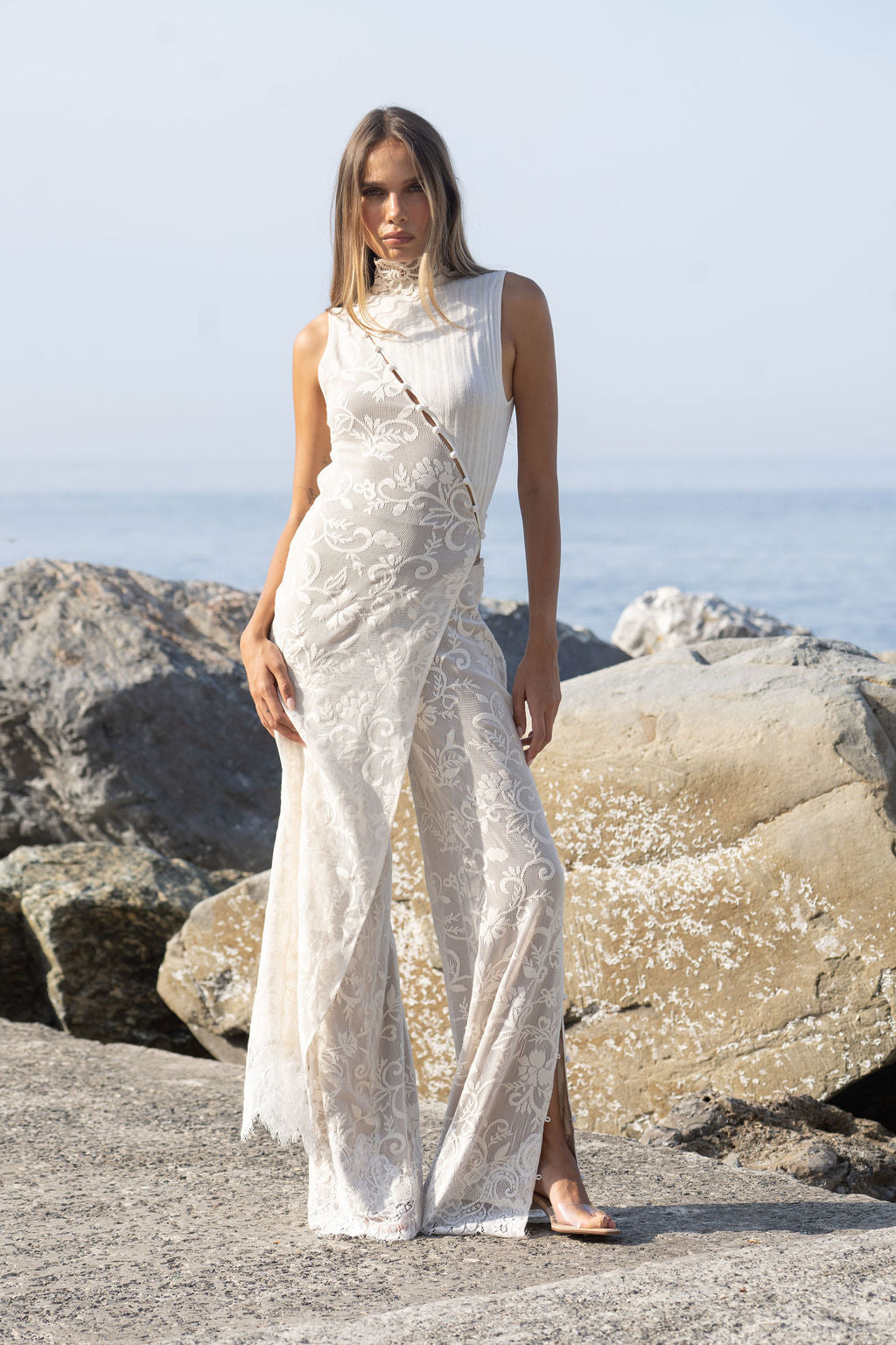 A mid-rise pant with a flared leg and lace fabrication. The Lottie Lace Pants feature knit covered buttons down the outer seams and a layered lace at the hem.