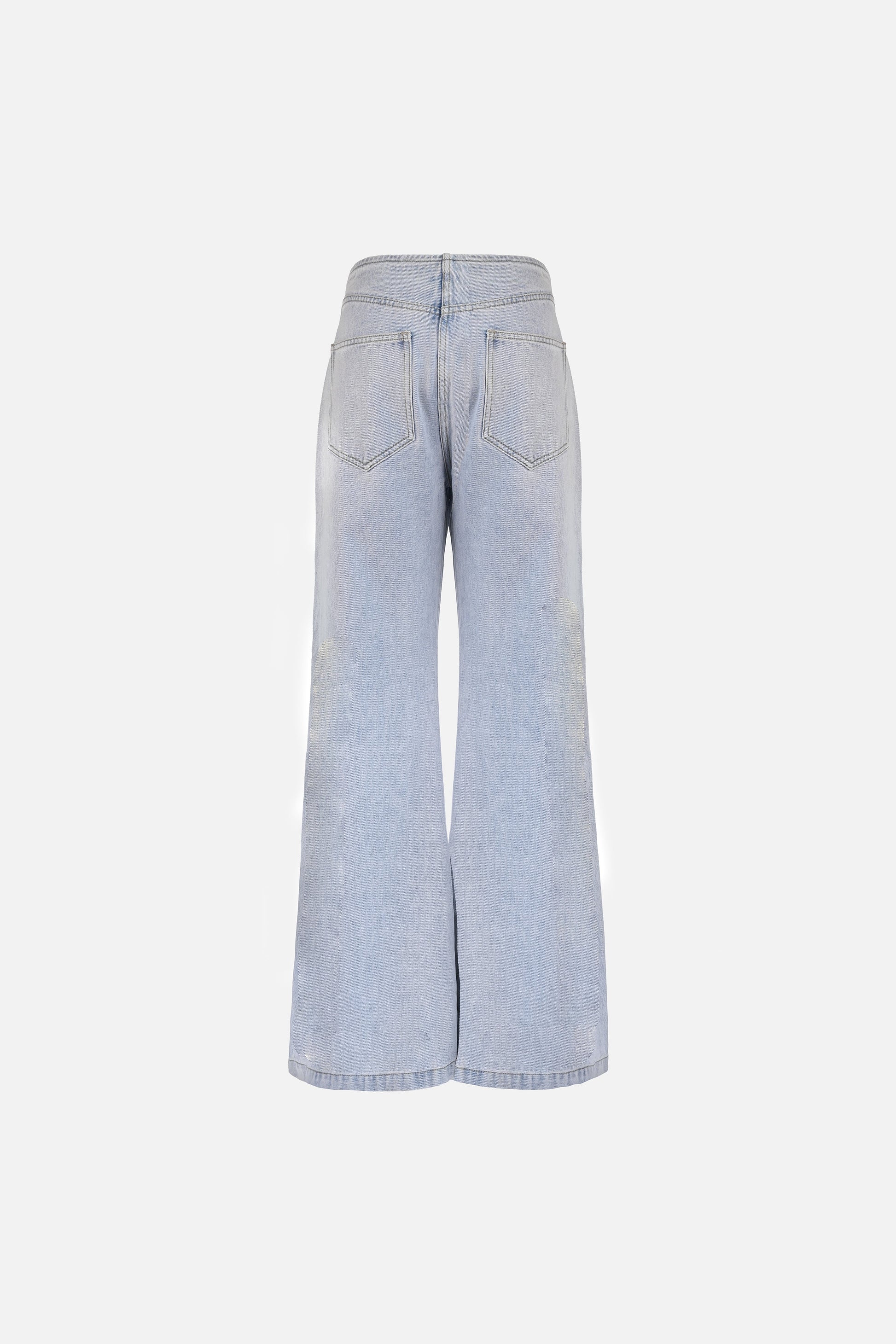 A reimagining of the classic jean, this denim features a short waist height with a wide-leg hem. The exaggerated button placket is both functional and lengthening to the design.