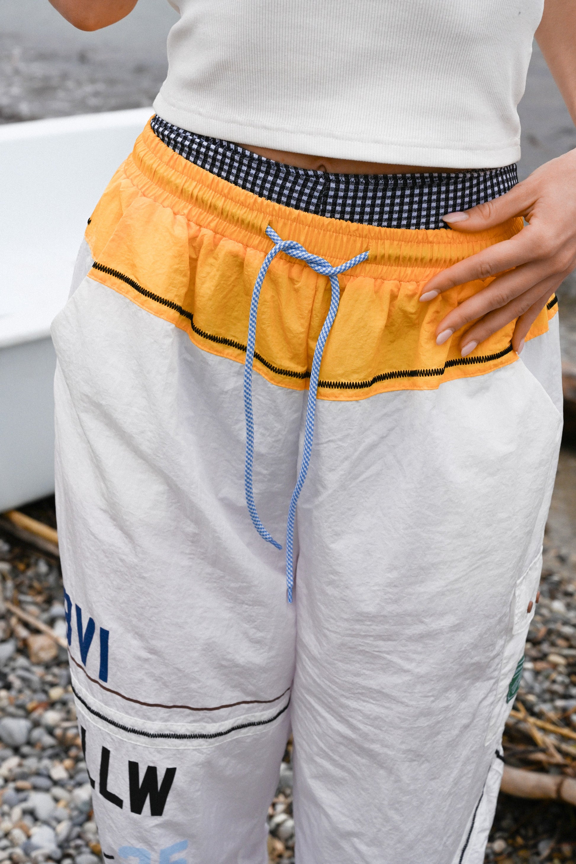 Inspired by a sail out of BVI, our Mast Joggers are a unisex-fit nylon jogger with various sail markings. Number markings are printed on the windbreaker material in light blue and black with thick stitches lining each leg.