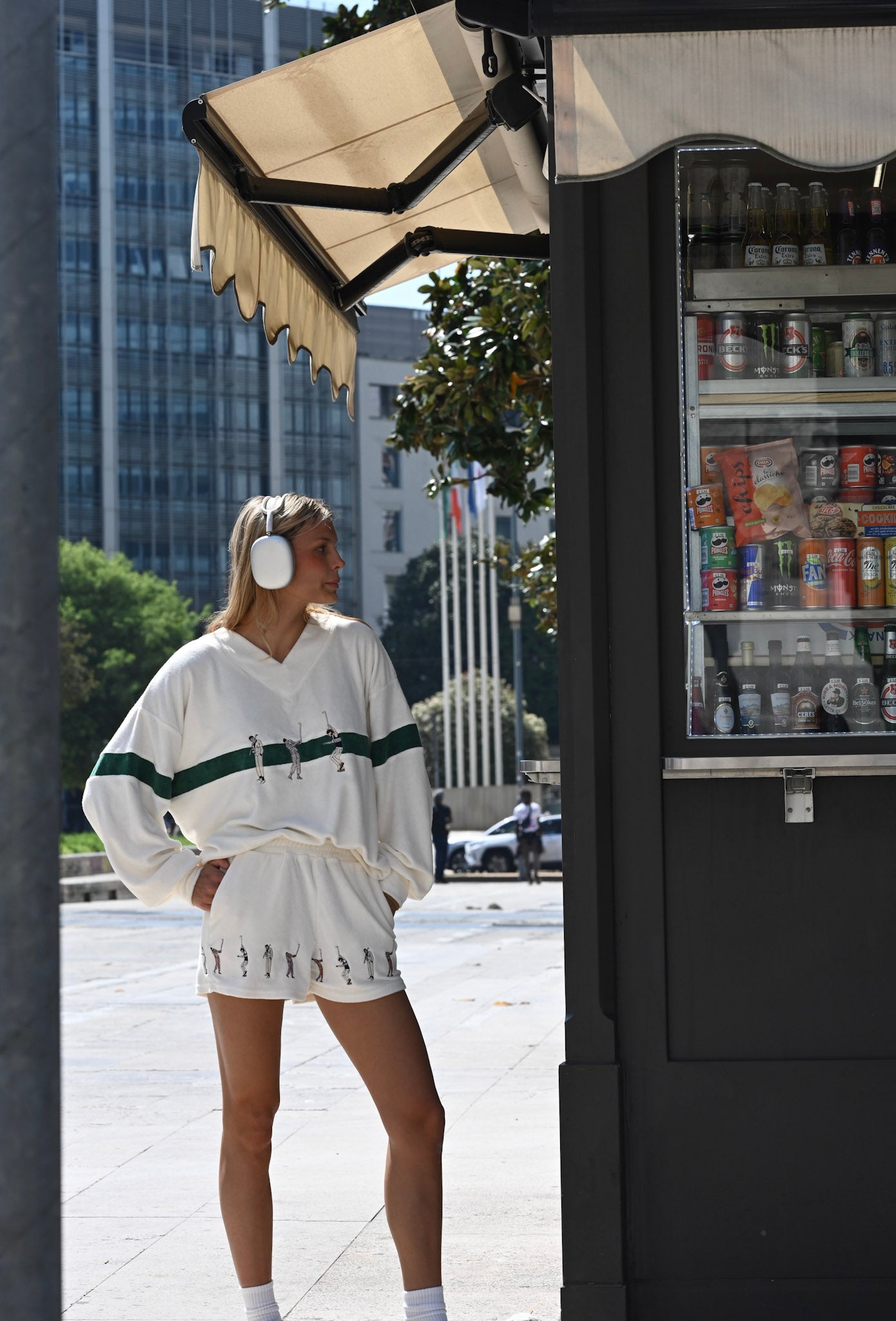 For the ones who celebrate on the golf course, the Members Terry Pullover is embroidered with three golfers fitted in neutral colors moving on the course. The pullover is cut from lightweight terry fabric with thick green stripe across the sleeves and chest.