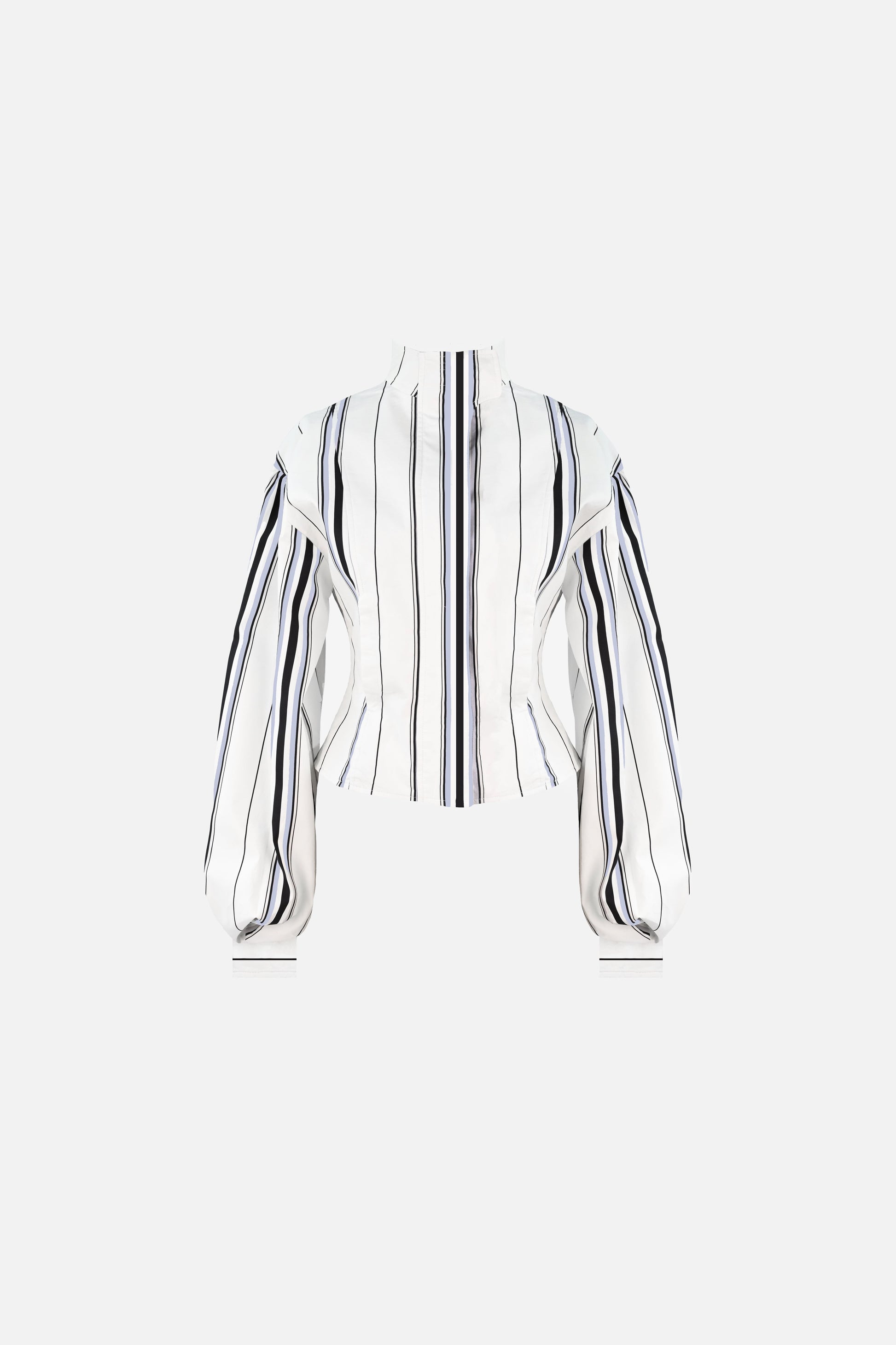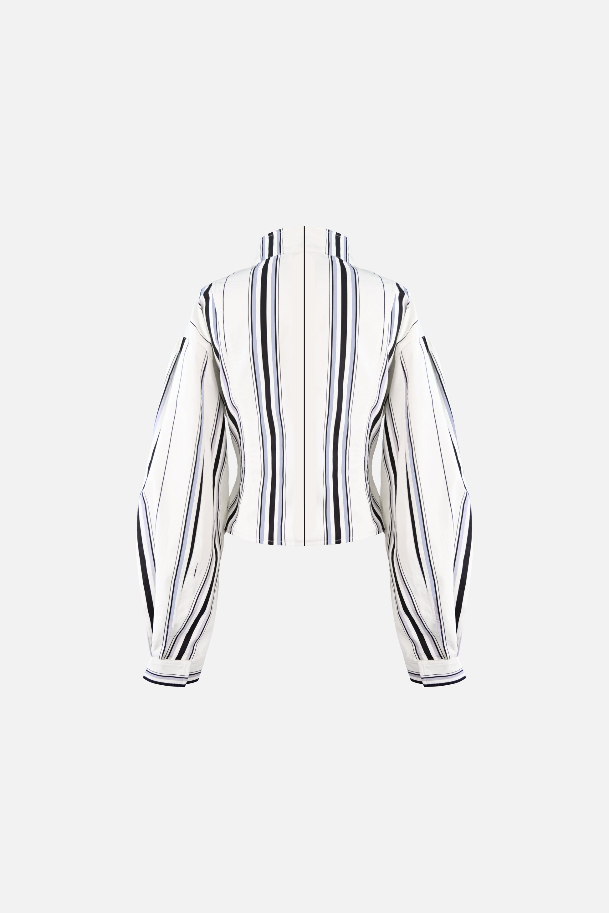 A sculptural construction, the Mindy Jacket is defined by its voluminous sleeves and sharply tailored lines. The exaggerated silhouette floats effortlessly, while a crisp striped pattern covers the cotton composition.