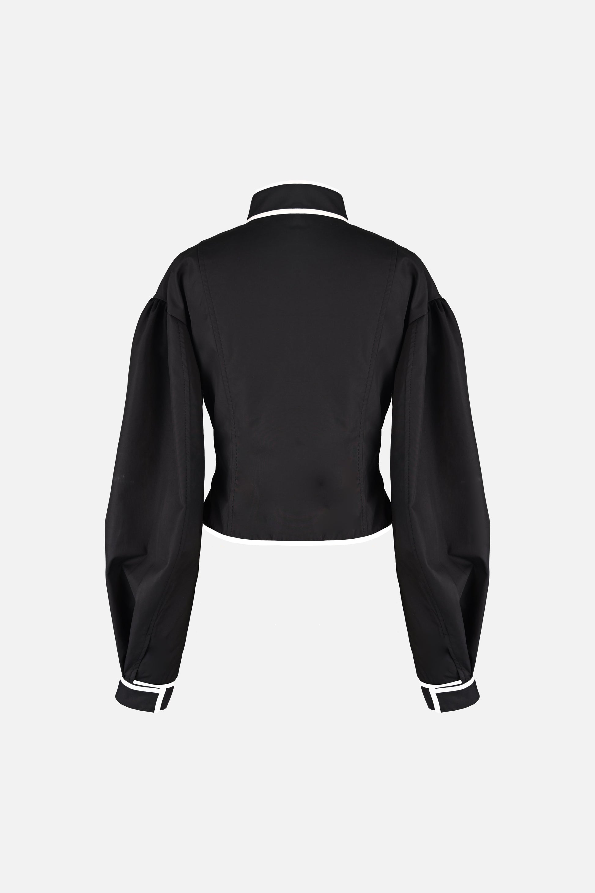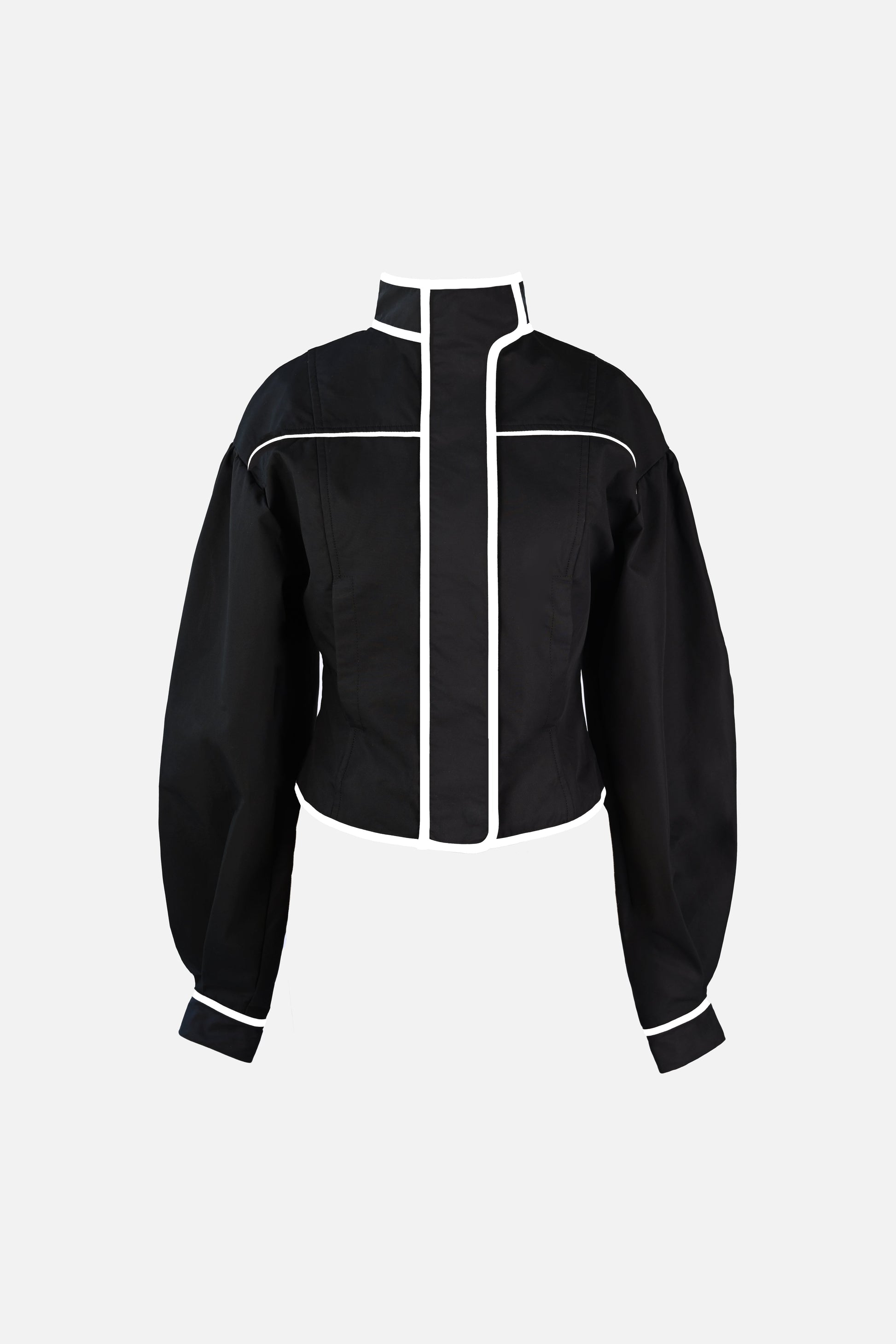 A sculptural construction, the Mindy Jacket is defined by its voluminous sleeves and sharply tailored lines. The exaggerated silhouette floats effortlessly, while crisp white piping traces its architectural structure.
