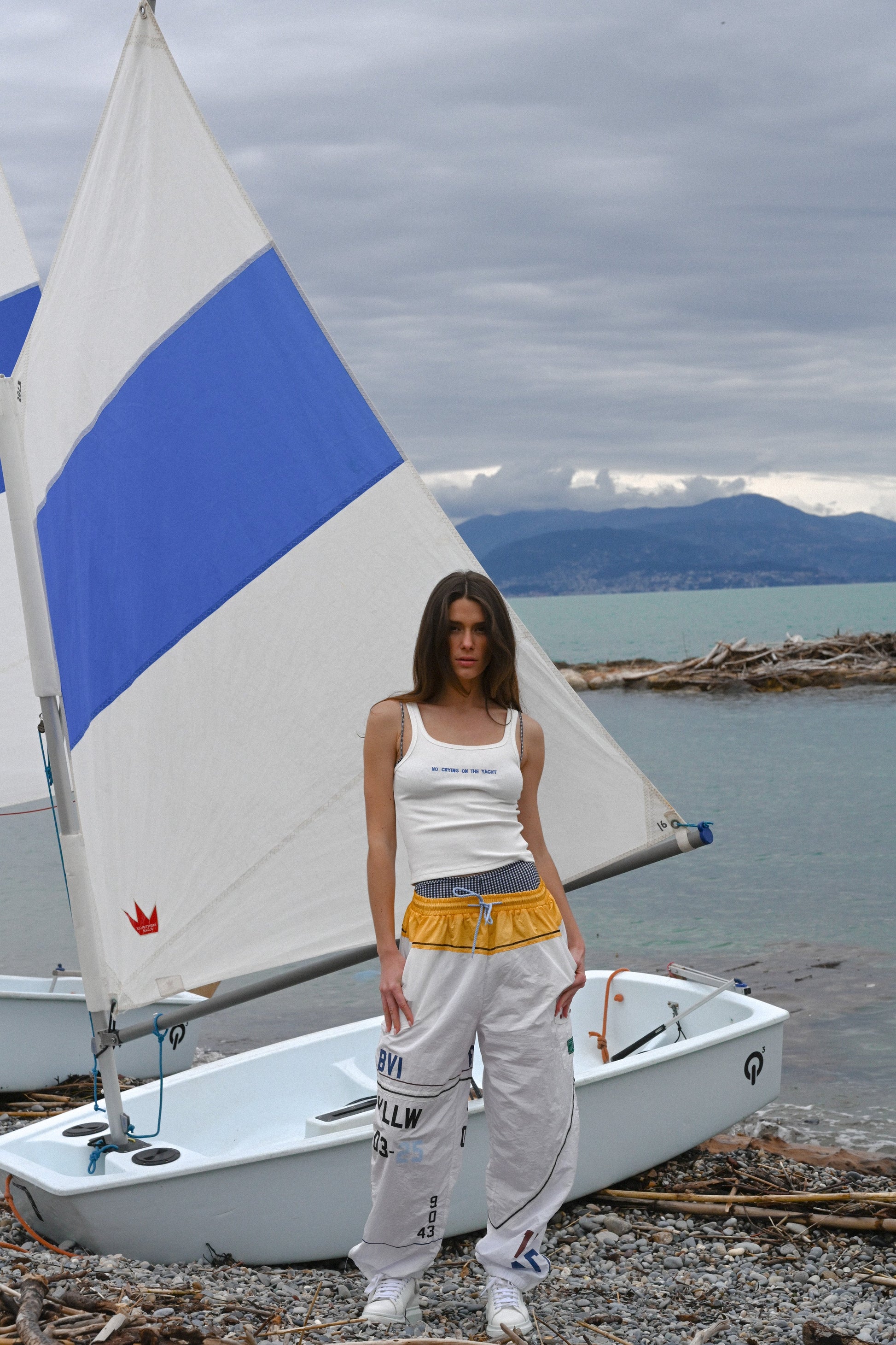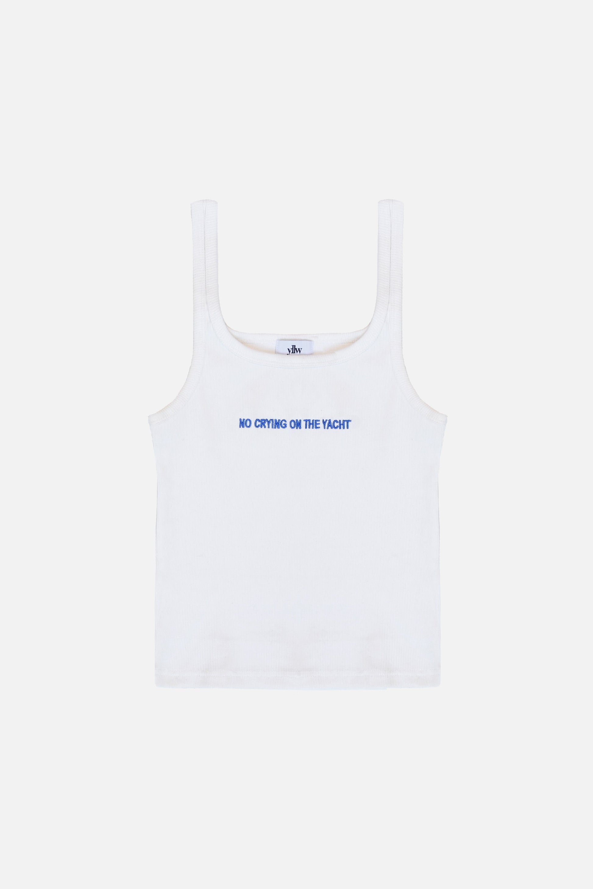 "No Crying on the Yacht" embroidered across the front. Slim fit tank top in a ribbed knit featuring a square round neckline and narrow tank straps.