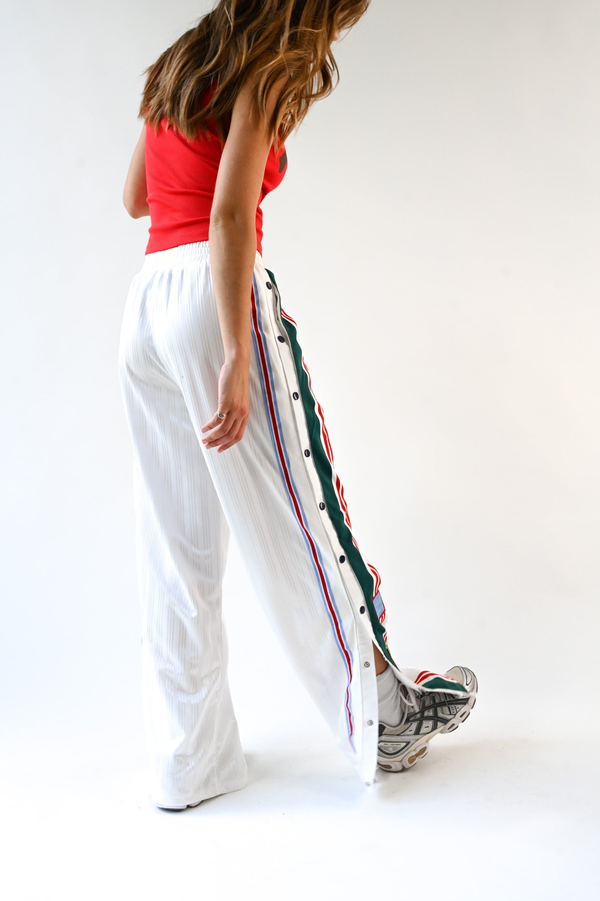 Tearaway Pants made from shiny, breathable material with a thin striped motif and wide ribbed trim along the side seam. The ankles are complete with embroidered patches on each side.