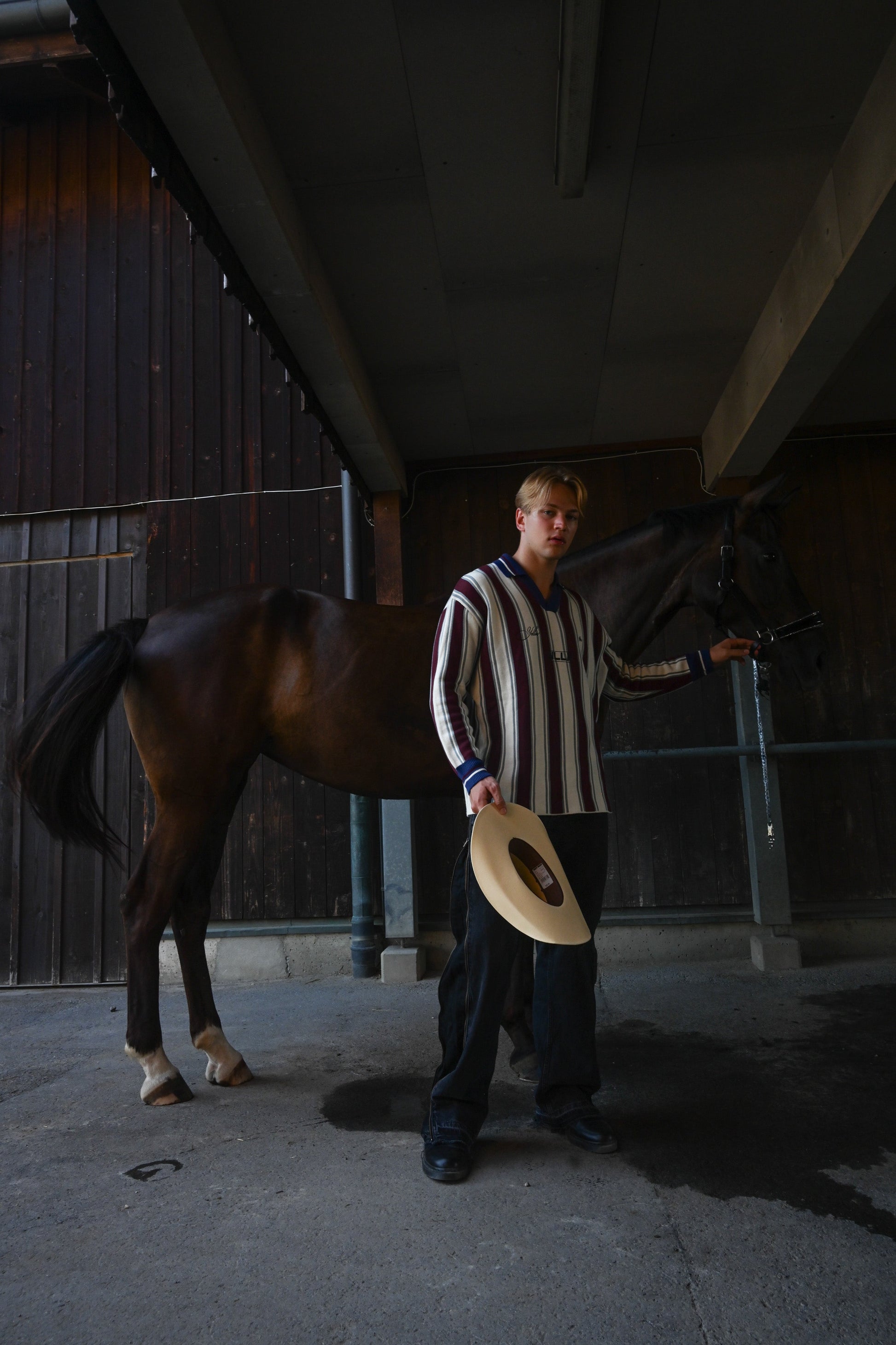 The Racer Knit is a thick sweater that marries warm burgundy and cool colors of ivory and grey in a vertical striped pattern with branded embroidery on the chest. The sweater fits oversized with a relaxed knit collar and V-neck.