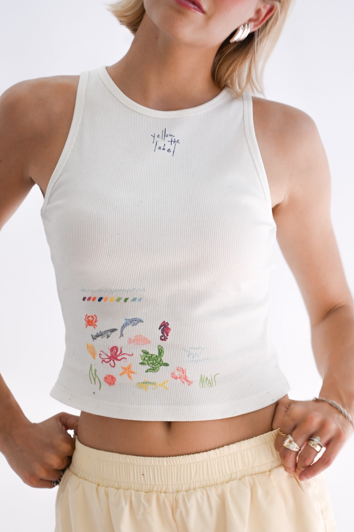 Inspired by the creatures under the sea, this tank reminds us of walking through our childhood vacation gift shop. The ribbed cotton tank hits just below the waist and has a snug fit up to the high neckline.