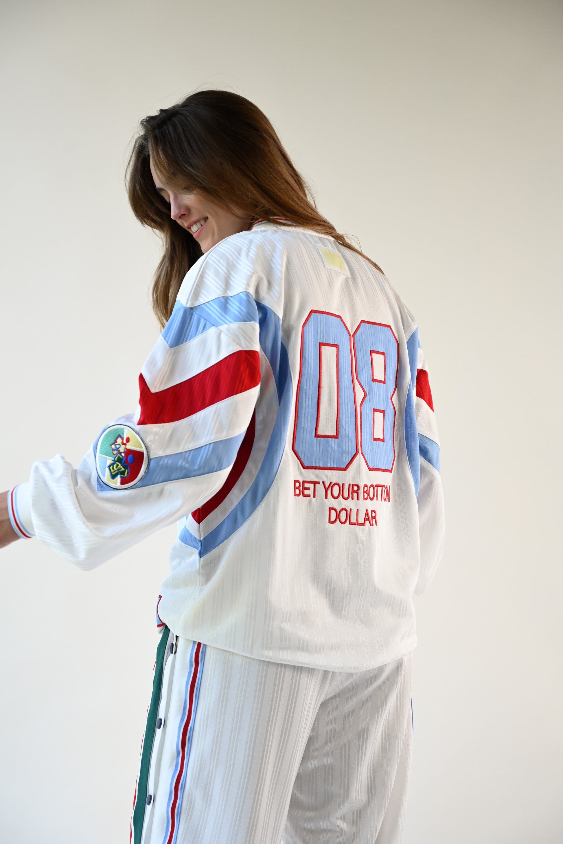 Serotonin Hockey Jersey is our long-sleeve jersey made from shiny, breathable material with a thin striped motif and '08' graphic at the chest. The sleeves are carved with blue and red lines with embroidered appliqués down each sleeve.