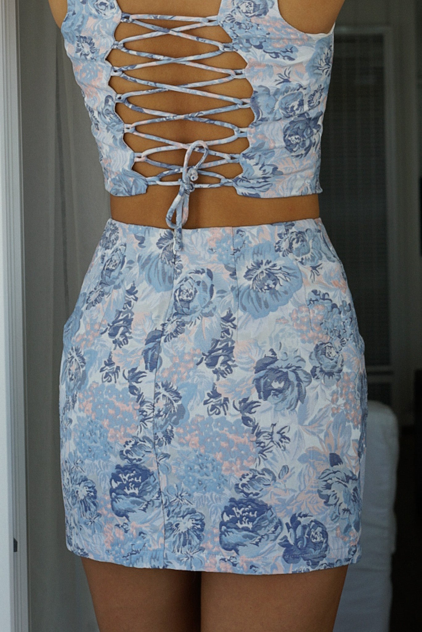 A classic mini skirt, the Shea Skirt features a high waisted fit in a luxe, upholstered floral fabric with blue and pink hues.