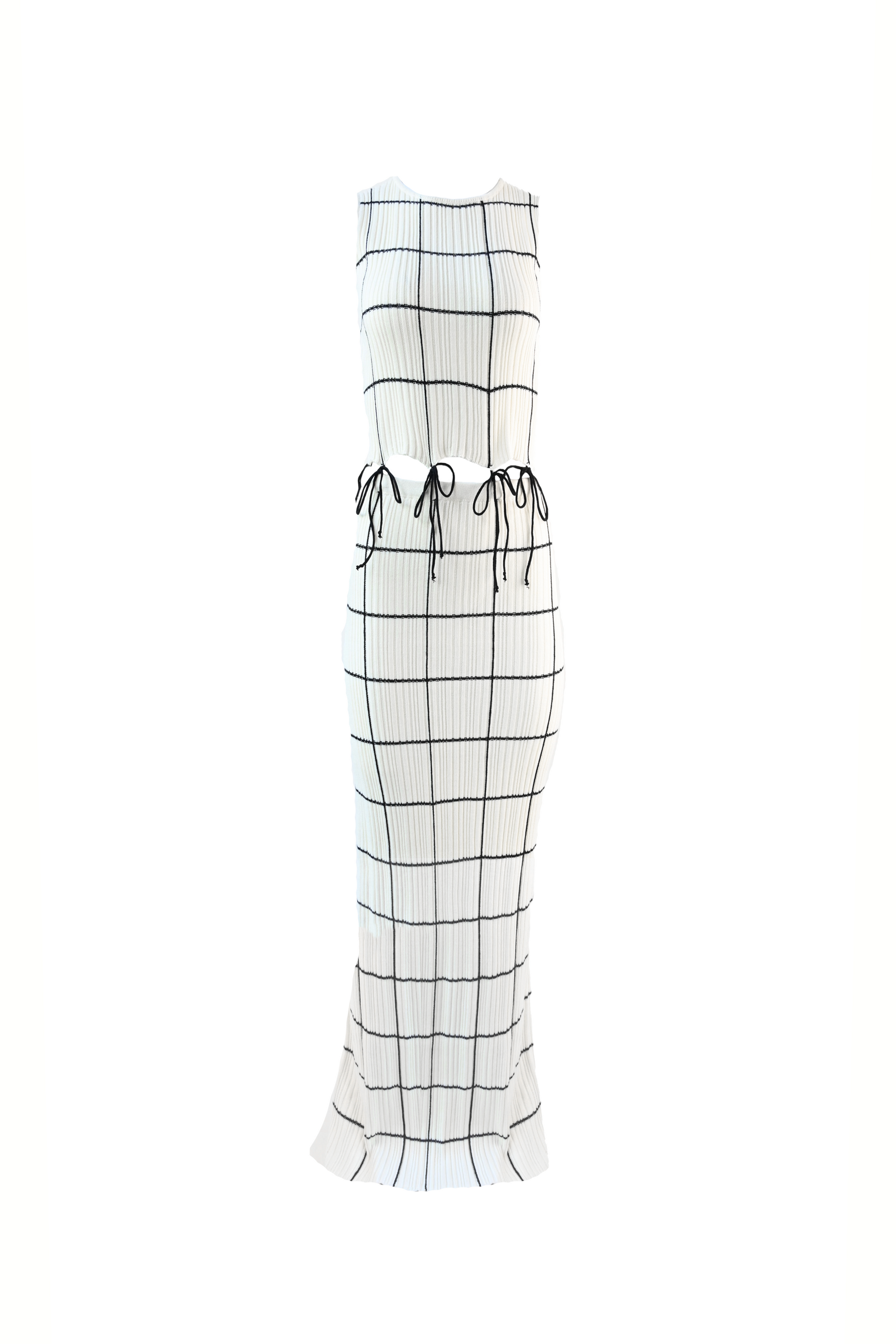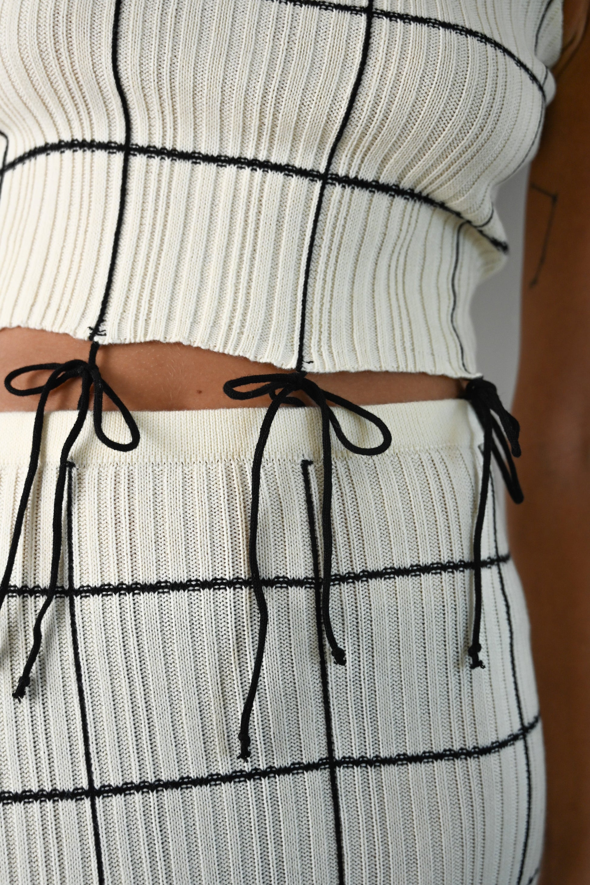 The Tekla Knit Set is designed with a thick knit fabric that is perfect for dressing up or dressing down. The top and skirt are linked by self-tying, thin bow ties for adjustability.