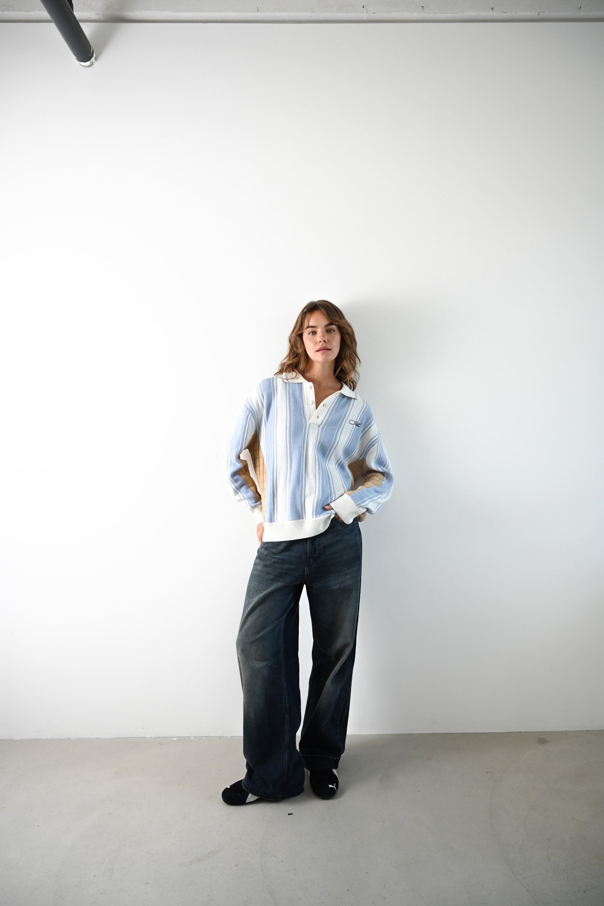 The Theo Knit is our long-sleeve sweater polo in a luxe wool and cotton blend and relaxed-fit silhouette, featuring a two-toned stripe pattern, grid embossed accent, three-button placket, classic polo collar and banded hem and cuffs.