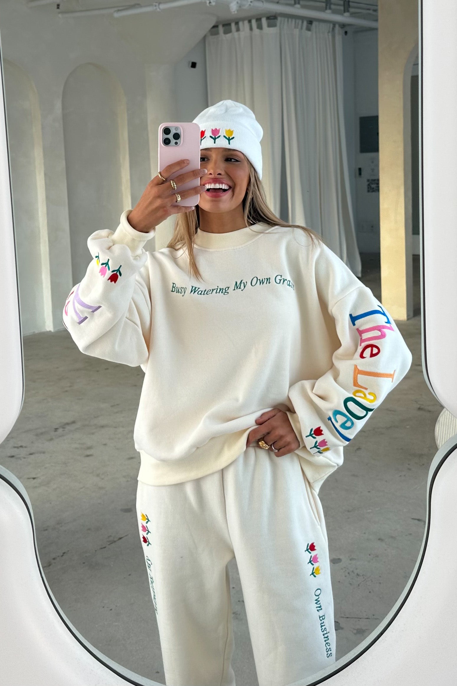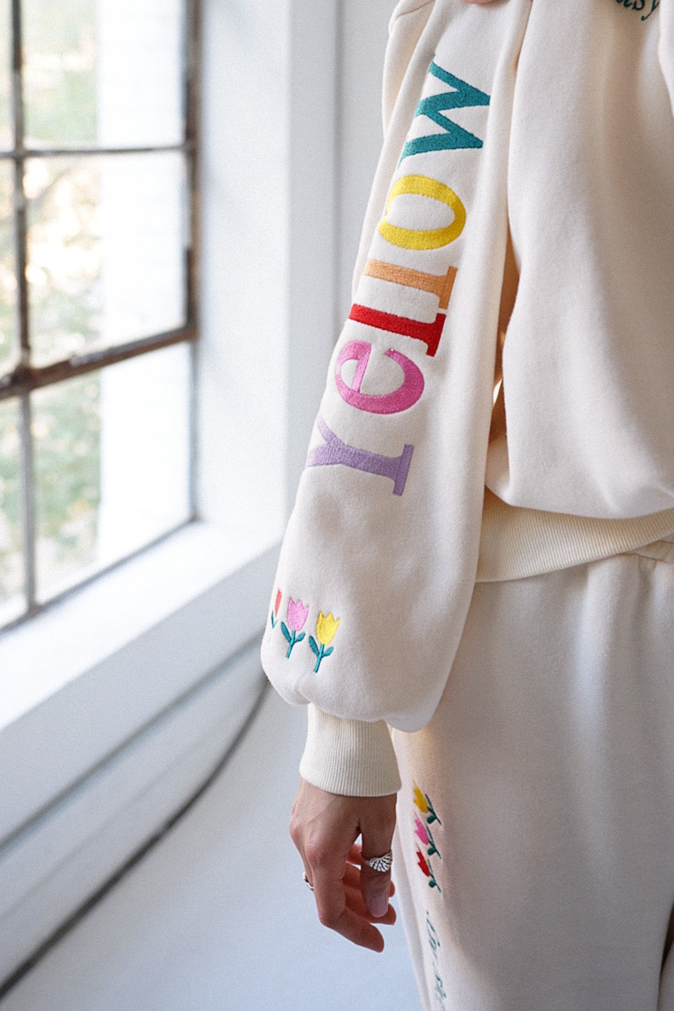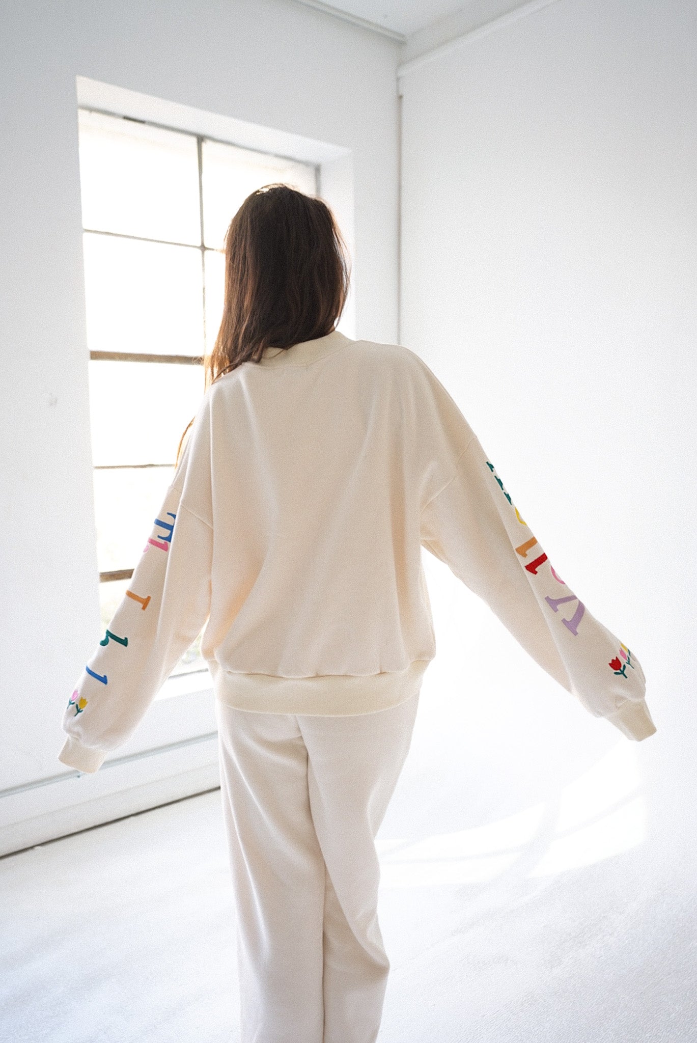 Our most-coveted oversized sweatshirt brings vibrant embroidery designs to your arms and chest, inspiring you to stay focussed on yourself.
